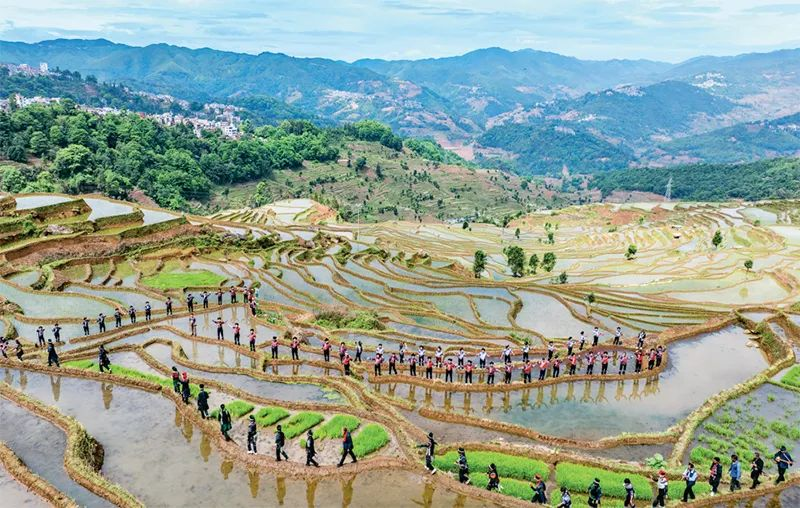? ? ? ?為推動自然資源全要素一體化保護修復,各地加強整體謀劃山水林田湖草沙等各類自然資源要素空間布局。在云南省,紅河哈尼梯田中的水資源在森林、村寨、梯田、水系中循環(huán)往復,呈現(xiàn)“四素同構”的農(nóng)業(yè)生態(tài)系統(tǒng)。圖為2025年5月2日,人們在紅河縣甲寅村“開秧門”儀式上,沿著梯田踏歌而行(無人機照片)。 新華社記者 胡超/攝