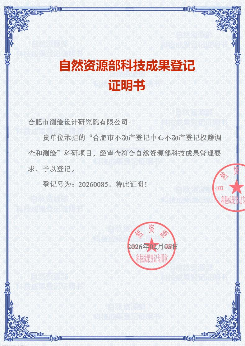 ? ? ? ? 近日,公司技術(shù)質(zhì)量部牽頭完成《合肥市不動(dòng)產(chǎn)登記中心不動(dòng)產(chǎn)登記權(quán)籍調(diào)查和測(cè)繪》項(xiàng)目的科技成果登記工作,該項(xiàng)目經(jīng)嚴(yán)格審查,符合自然資源部科技成果管理相關(guān)要求,成功獲得自然資源部頒發(fā)的科技成果登記證明書。